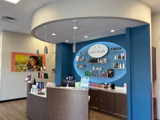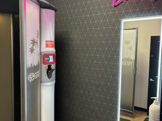 Accent walls come to life with bold paint and stylish wallpaper in the tanning salon.